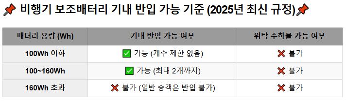- 일부 항공사는 100Wh 이하라도 개수를 제한할 수 있으므로, 항공사별 세부 규정을 확인하는 것이 안전합니다.