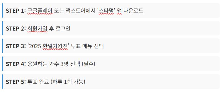 한일가왕전은 단순한 음악 경연을 넘어 두 나라 문화 교류의 상징적 의미를 담고 있습니다: