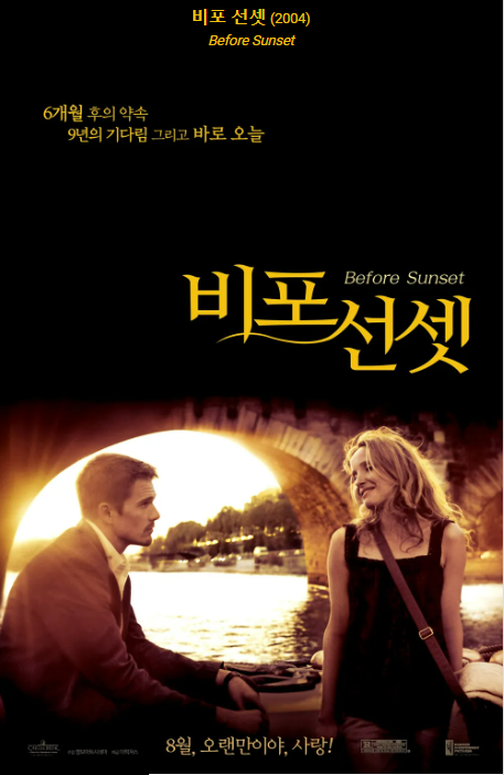 에단 호크(Ethan Hawk)와 줄리 델피(Julie Delpy)는 그들의 캐릭터에 깊이와 진정성을 불어넣는 아스트랄한 연기를 보여줍니다. 이제 나이가 들어 더 내성적이 된 그들의 제시(Jesse)와 셀린(Celine)의 묘사는 진실하고 공감할 만하게 느껴집니다. 그들의 연기는 그들의 관계를 설득력 있고 감정적으로 충전시켜 줍니다.. 그들의 연기는 시간의 흐름과 그것이 우리 삶과 관계에 가져온 변화에 대해 생각하게 만들었습니다. 사랑, 회한, 시간의 주제 "비포 선셋(Before Sunset)'은 사랑, 회한, 그리고 물러설 수 없는 시간의 흐름이라는 주제를 깊이 파고듭니다. 제시와 셀린의 교류는 그들의 역사, 그들이 내린 선택, 그리고 그들이 살아온 삶에 대한 성찰로 가득 차 있습니다. 이 영화는 무엇이 될 수 있었는지에 대한 생각을 독하게 탐구하여 갈망과 영혼 탐색을 이끌어냅니다. 한 번의 연결에 대해 성찰하고 태어나지 않은 가능성을 의미하는 이 주제는 저 자신의 게스트와 선택을 고려하게 만들면서 저에게 열정을 불러일으켰습니다.